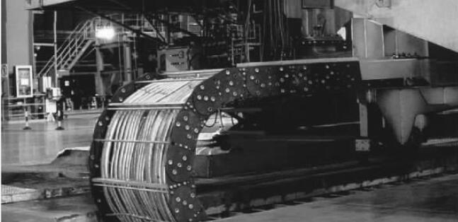 薄板坯連鑄機機組是具有國際先進水平的冶金連鑄設備,該設備核心部位主要有煉鋼( 清渣與質量的調整及鋼水成份控制) 、鋼液給送裝備( 鋼包迴轉臺,中間罐車) 、薄板坯成型裝備( 結晶器、結晶器振動裝置; 扇形段與拉矯機,引錠桿) 、成材處理裝置( 火熖切割機,去毛剌機,輥道等) ,而作為銜接、牽引和保護這些部位的“鋼制拖鏈”則起到重要作用。特別由于薄板坯連鑄機因鑄速高,鑄造穩定性嚴格,尤其要求它的拖鏈在煉鋼過程中的脫硫傾翻,扒渣處理時運行平穩,承載均勻,從而保證鋼質的調整與鋼水成份的控制。在鋼液給送過程中,要求中間罐車移動的拖鏈,能克服苛刻的條件,實現高承載、高速度、高精度地運動,將能源、動力安全傳遞到位,使之實現鋼液給送快速、平穩,否則就會使連鑄給液中斷,甚至釀成事故。在成材處理裝置中,鋼坯打標,定長切斷,迴轉輸送也無不使用到拖鏈,且要求運動可靠,不能中斷,否則整個連鑄卡殼,會釀成事故。